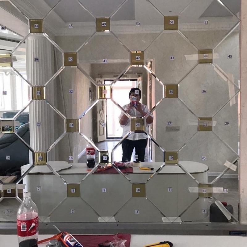 • Проект Зеркальное панно в салоне, Москва, серебристая зеркальная плитка "восьмиугольник" и золотистая зеркальная плитка квадратной формы фото проекта