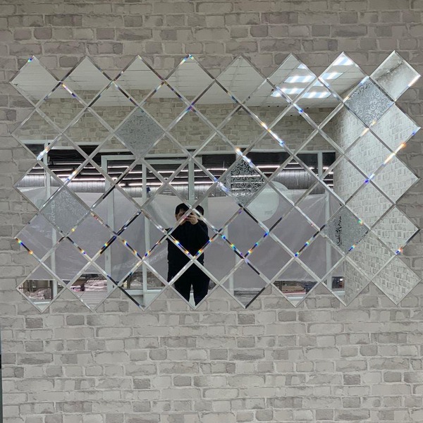 Использована квадратная серебристая зеркальная плитка размером 18х18.